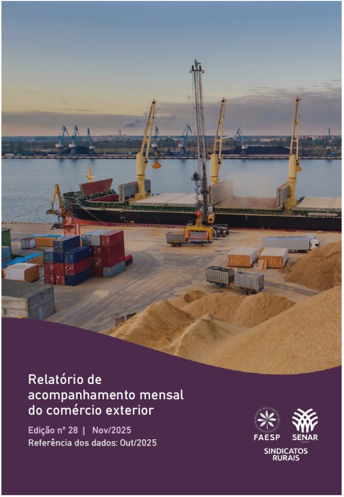 Em outubro de 2025, as exportações do agronegócio paulista somaram US$ 2,64 bilhões, queda de 11,7% em relação ao mesmo mês de 2024, enquanto as importações cresceram 3,9%, alcançando US$ 511,8 milhões. Diante desse cenário, o saldo da balança comercial do setor foi positivo em US$ 2,1 bilhões. Os números constam do relatório elaborado pelo Departamento Técnico e Econômico da Federação da Agricultura e Pecuária do Estado de São Paulo (Faesp), a partir de dados do MDIC – ComexStat.