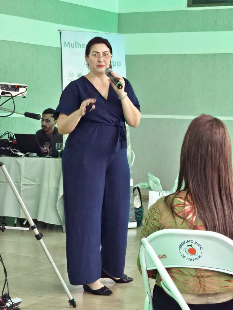 Mais tarde no mesmo dia foi a vez do módulo “Mulheres: Descubram-se no Campo”, da fase 1 das Semeadoras do Agro. A cidade, conhecida historicamente pela produção de laranja, mostrou também sua força no protagonismo feminino rural. Estiveram presentes Rubens Romanini, presidente do Sindicato Rural de Itápolis, e sua esposa Maria Olga Romanini; Valdir, tesoureiro do Sindicato; e Luis Andia Filho, gerente regional do Sebrae-SP de Araraquara.