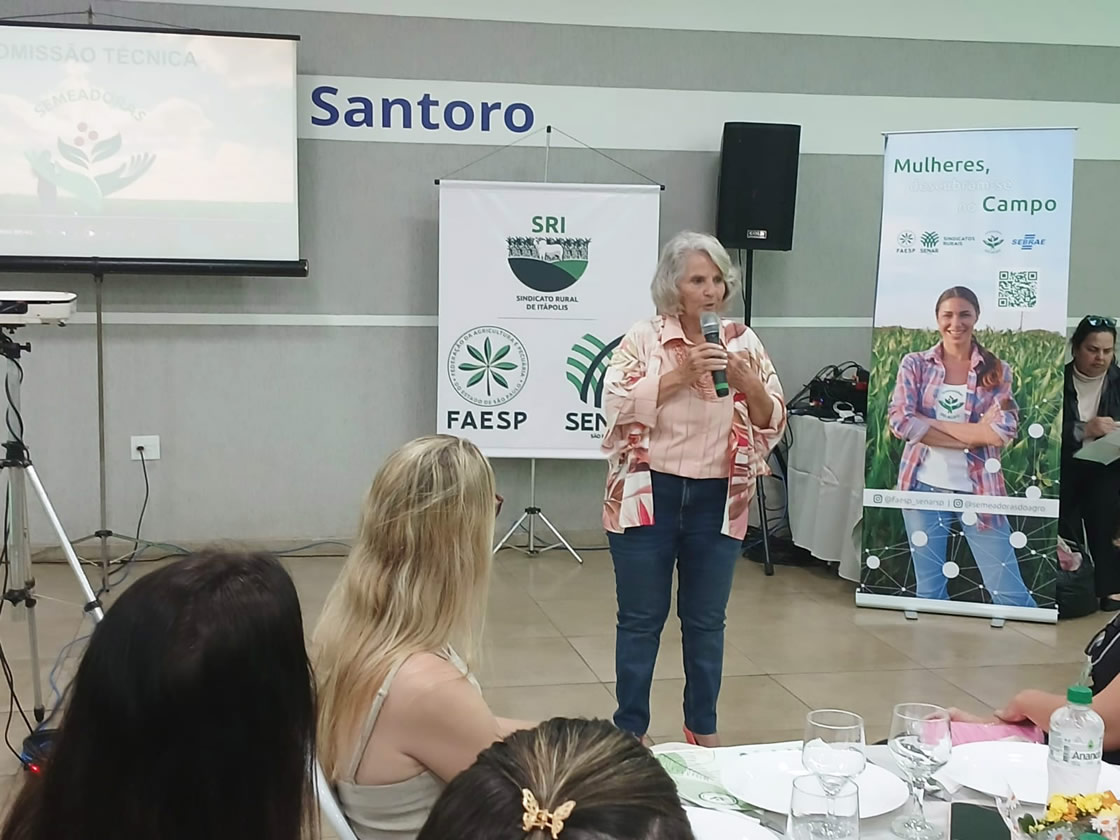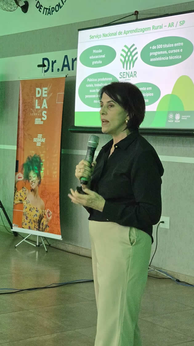 Mais tarde no mesmo dia foi a vez do módulo “Mulheres: Descubram-se no Campo”, da fase 1 das Semeadoras do Agro. A cidade, conhecida historicamente pela produção de laranja, mostrou também sua força no protagonismo feminino rural. Estiveram presentes Rubens Romanini, presidente do Sindicato Rural de Itápolis, e sua esposa Maria Olga Romanini; Valdir, tesoureiro do Sindicato; e Luis Andia Filho, gerente regional do Sebrae-SP de Araraquara.