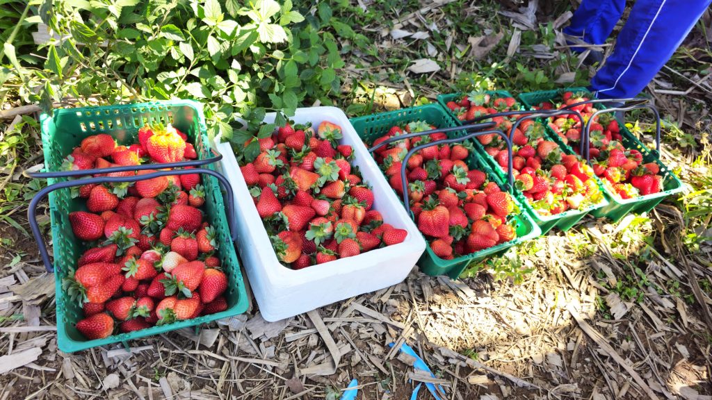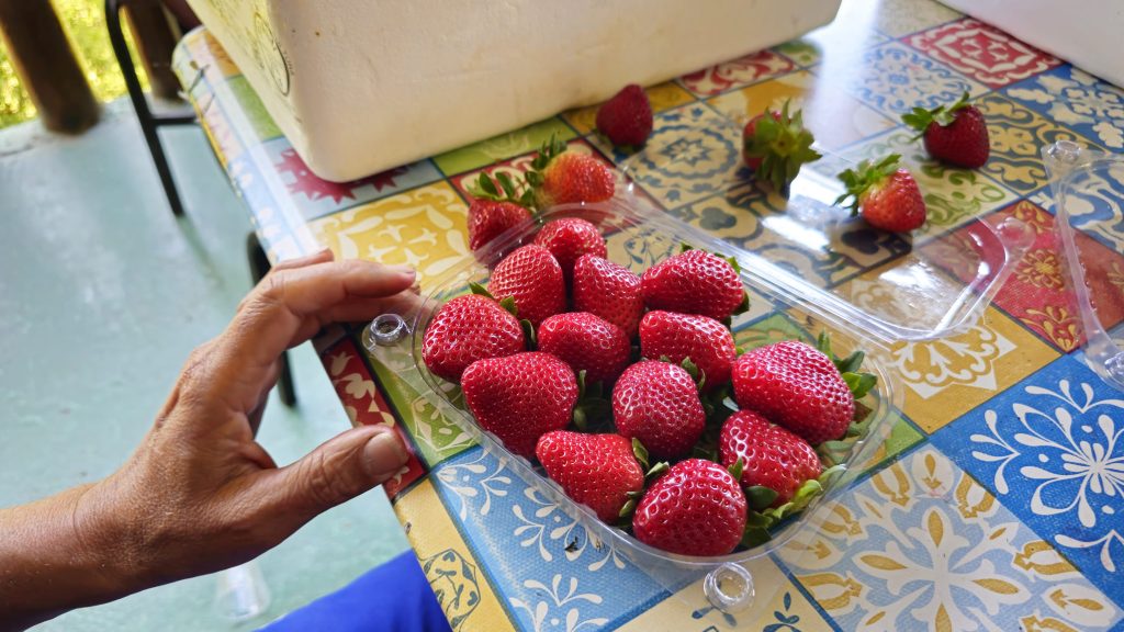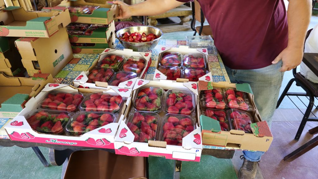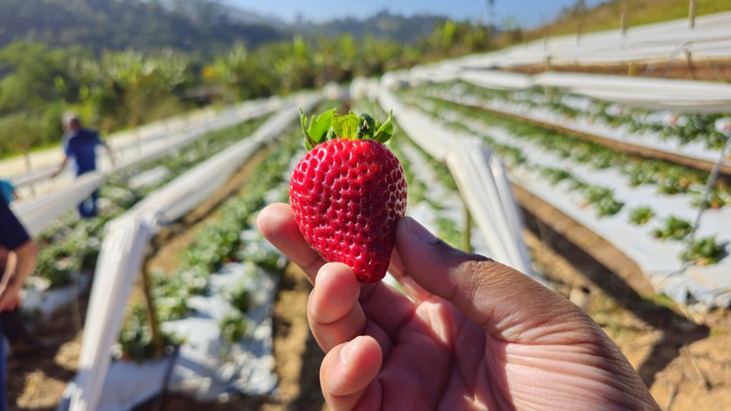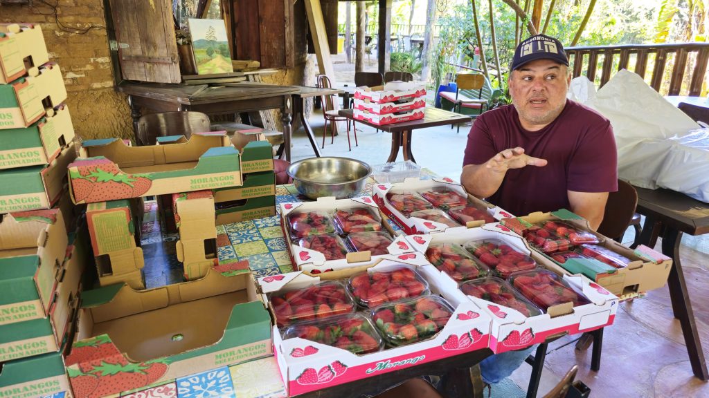 Trinta e quatro quilômetros adiante, na propriedade Chácara Pingo de Água, de José Vitorino de Camargo, em Juquitiba, a colheita foi realizada no último dia 10, com as mesmas técnicas e variedades de morangos.