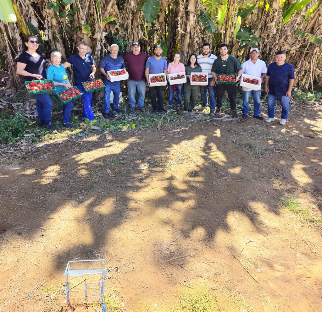 Sandro orientou-os quanto a higienização das mãos, a cor e o tamanho dos morangos, e o manejo para extraí-los.