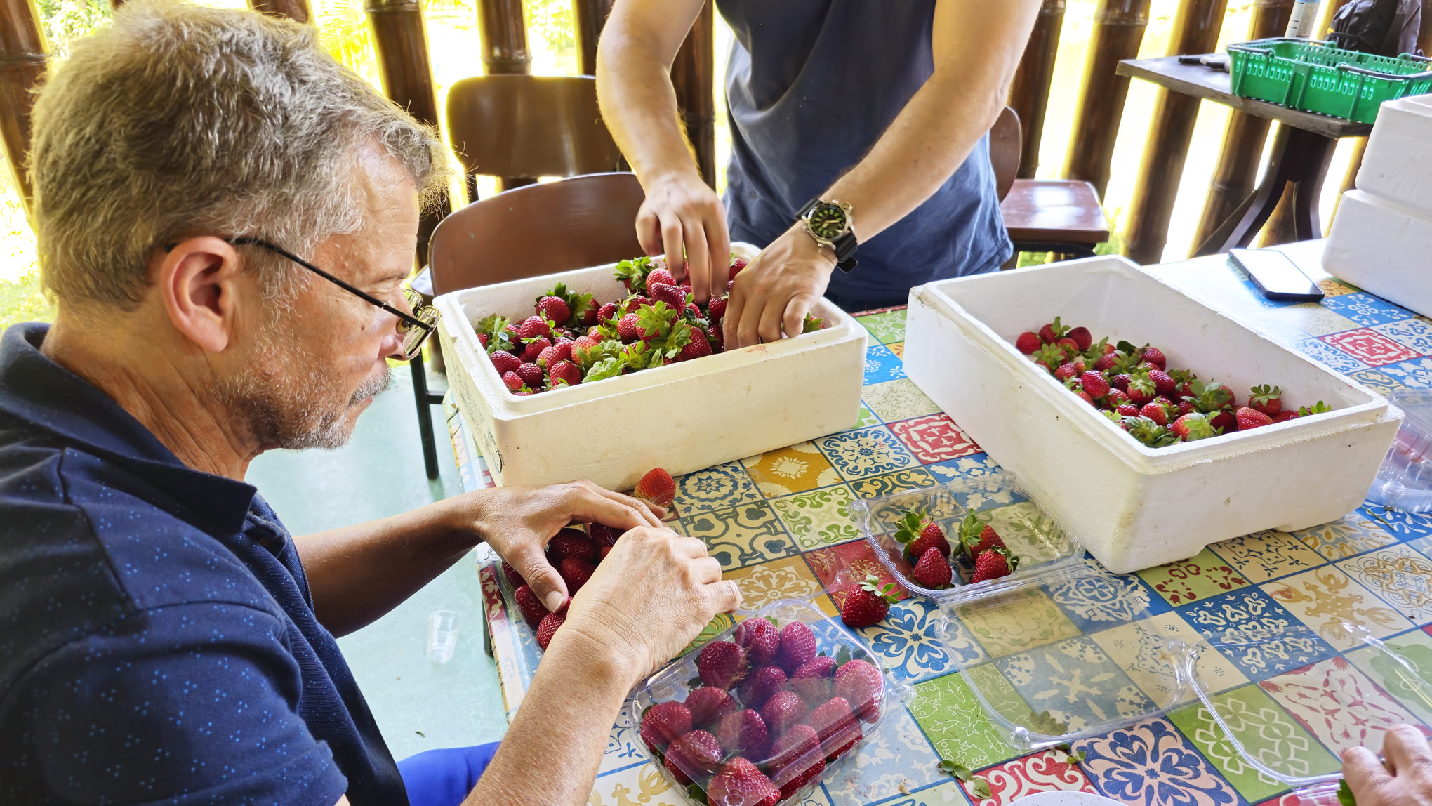 Sandro orientou-os quanto a higienização das mãos, a cor e o tamanho dos morangos, e o manejo para extraí-los.
