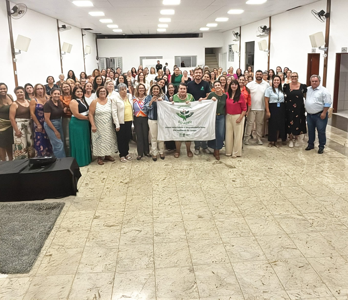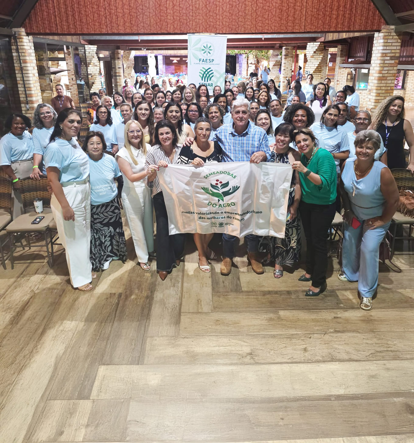Imagem ilustrativa do Encontro da Comissão Semeadoras do Agro realizado em São José dos Campos que mostra as mulheres que participaram do encontro segurando uma faixa.