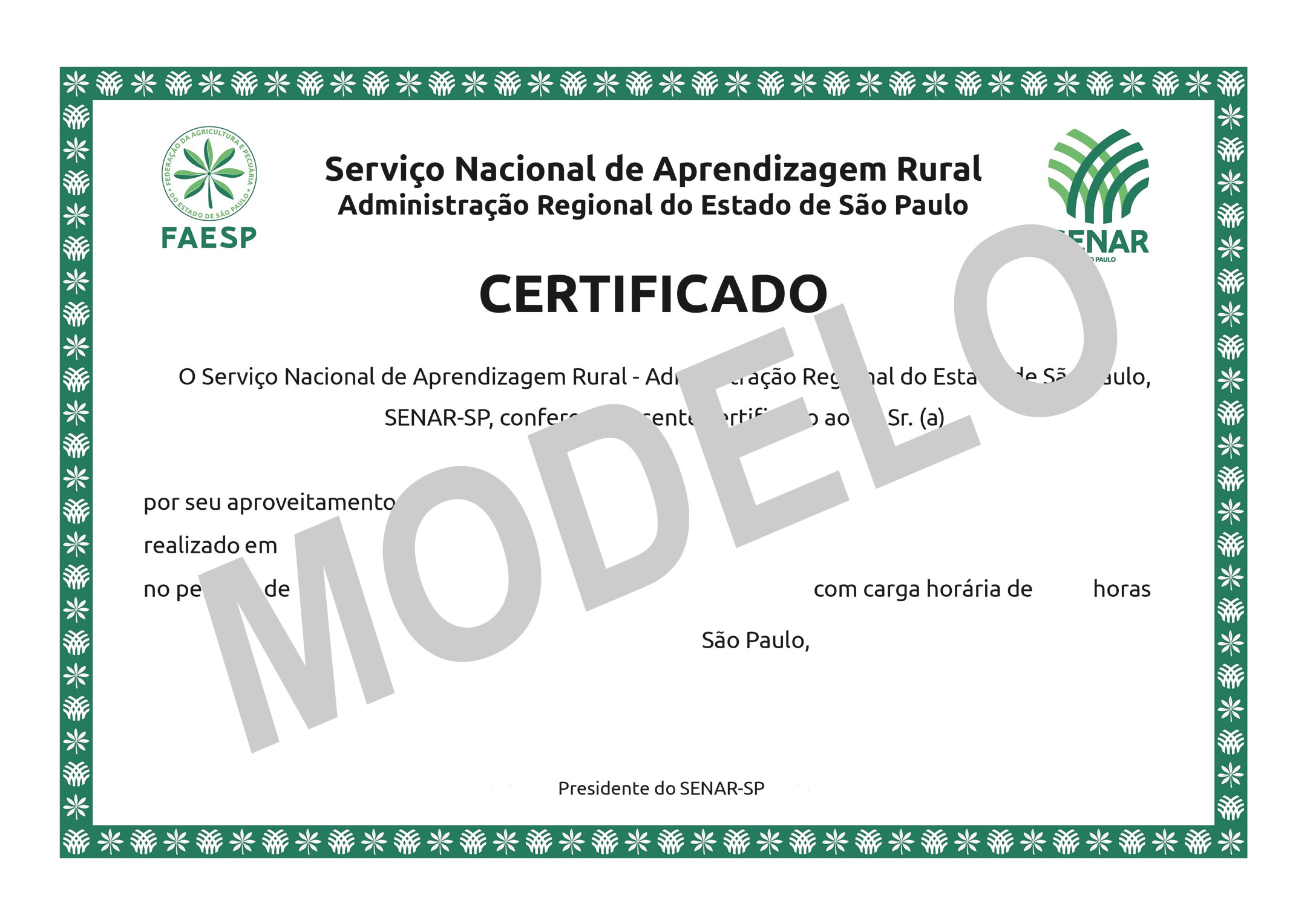 O participante dos cursos de Formação Profissional Rural que tenha obtido frequência mínima de 80%, aprovado pelo instrutor e apto para o exercício da ocupação, receberá o certificado de aproveitamento do Senar-AR/SP que tem reconhecimento e validade em todo Brasil.